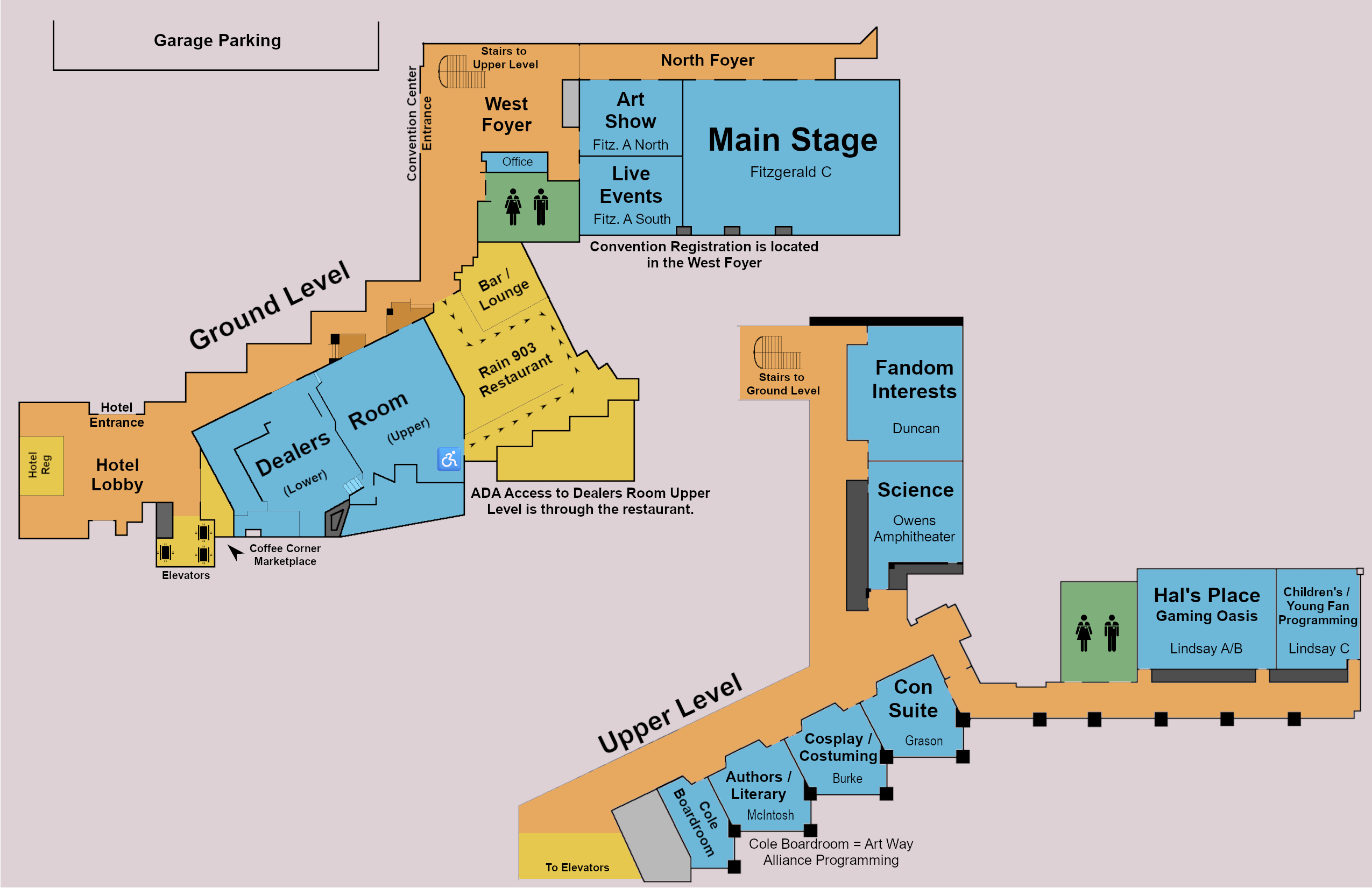 Dealers Room: ADA Access to "Upper Level" is through the restaurant